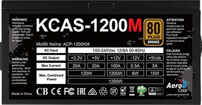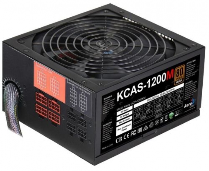 AeroCool KCAS 1200W PSU, Retail Box , Compliant with ATX12V Ver.2.4., Up to 85%+ efficiency with official 80Plus Bronze certificate, 20+4P and CPU 4+4P cable length up to 550mm - easy reach to all component, Safety and EMC certified by CE and TUV, 12 Month Limited warranty.