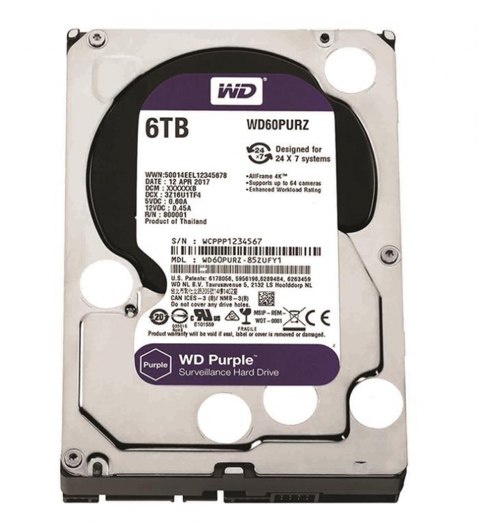 Western Digital Purple - 6.0TB 3.5” SATA3 6.0Gbps Surveillance HDD, Intellipower™ Speed Management, 64MB Cache, 150MB/s Host to/from (Sustained), AllFrame, HD Video Optimised